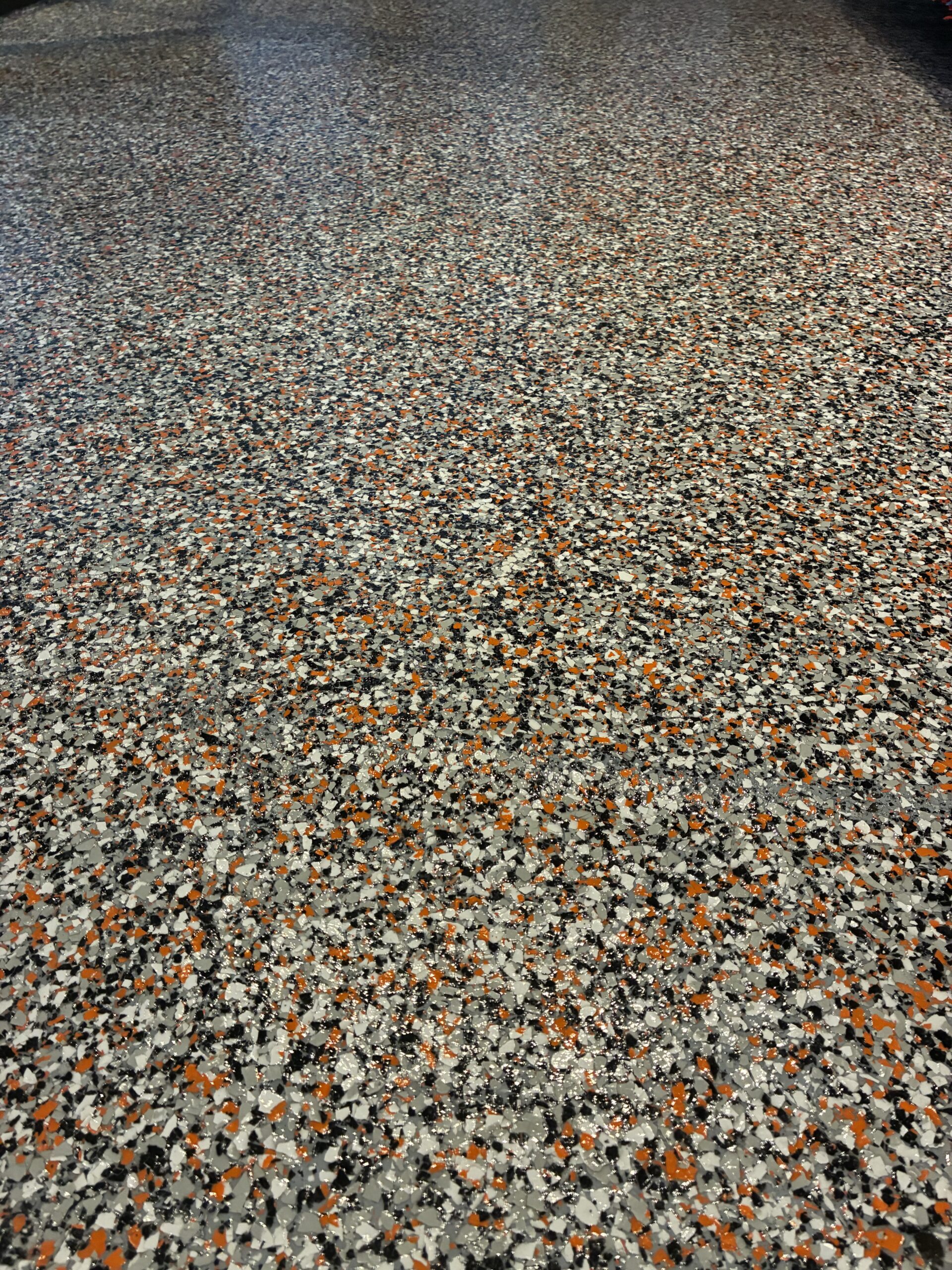 ポリフレークは、床に樹脂とカラフルな小片(フレーク)を塗布して仕上げる特殊な施工方法です。耐久性が高く、滑りにくいため、工場や倉庫、ガレージなどの安全性を高めたい場所に最適です。